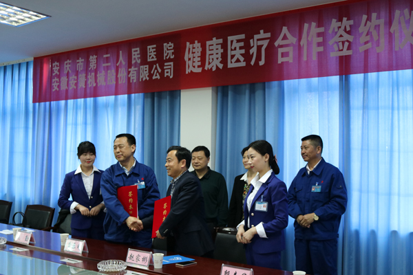 安慶市衛(wèi)計(jì)委施勤副主任、安慶市經(jīng)開(kāi)區(qū)管委會(huì)社會(huì)事業(yè)發(fā)展局局長(zhǎng)周健康,公司董事長(zhǎng)黃樂(lè)明、工會(huì)主席殷春華和市二院黨委書(shū)記、院長(zhǎng)趙家彬等出席簽約儀式。